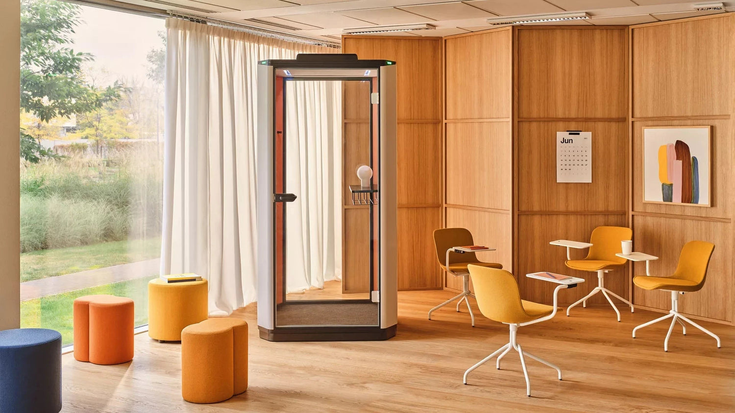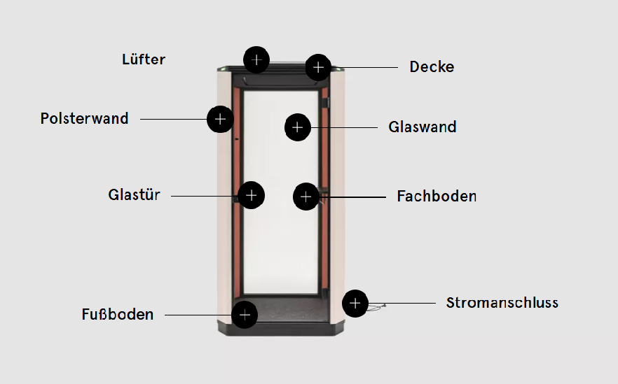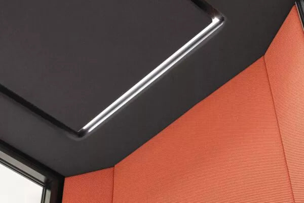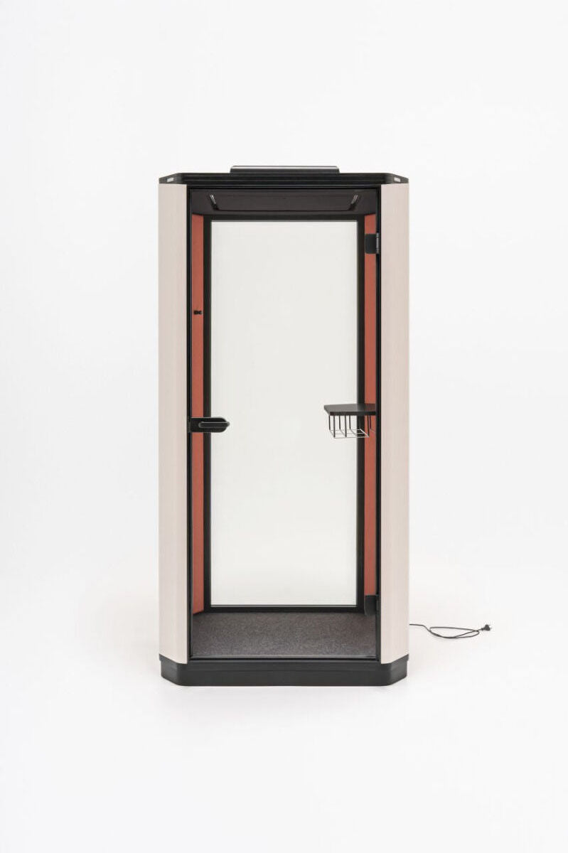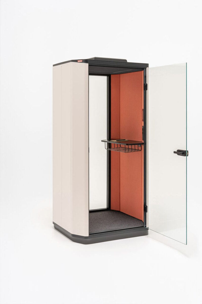 Sie sorgt für Ruhe und Privatsphäre bei Telefongesprächen, Videokonferenzen und konzentriertem Arbeiten. Die Außenbeleuchtung signalisiert die Verfügbarkeit der Kabine, indem sie rot leuchtet, wenn sich jemand darin befindet. Die Signalisierung wird über ein Bedienfeld gesteuert, welches auch mit den Lüftungs- und Innenbeleuchtungssystemen verbunden ist.