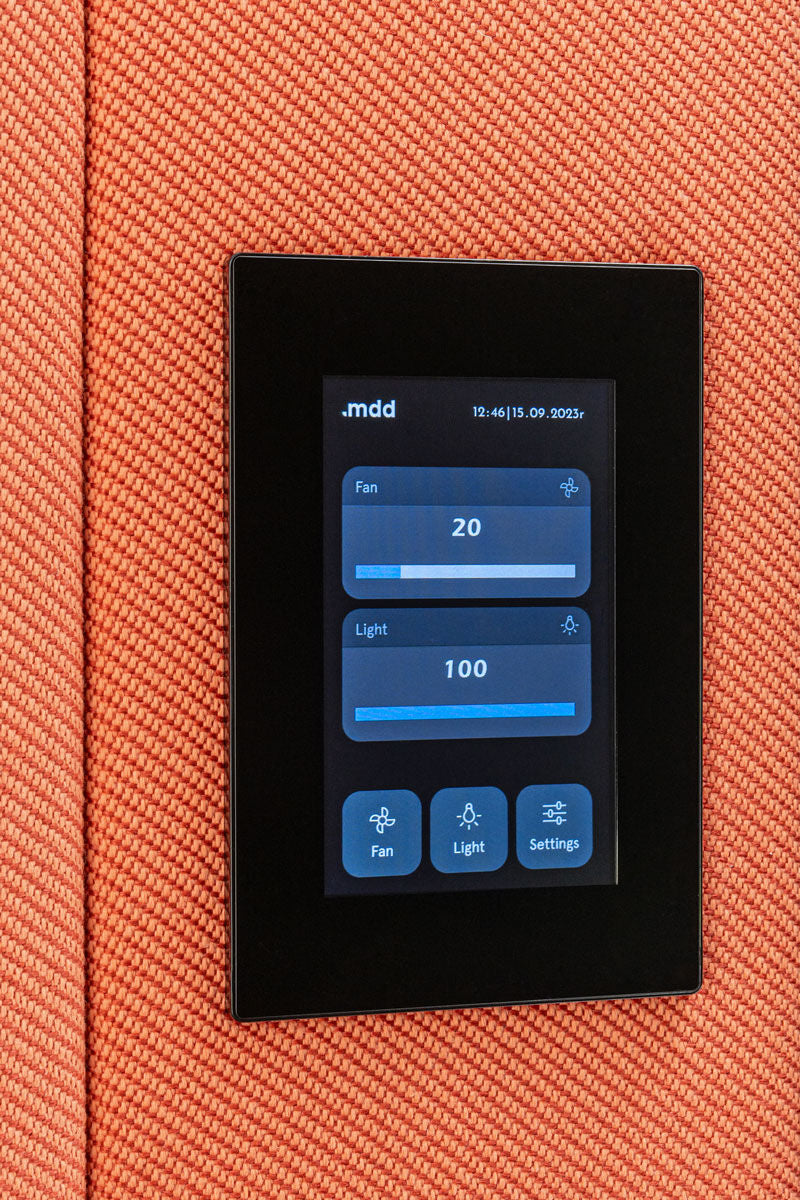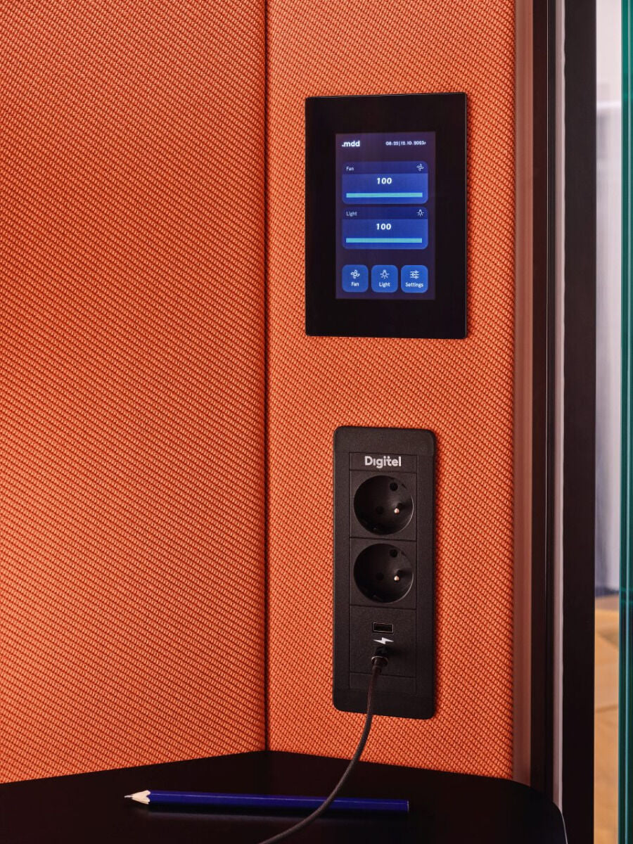 Die Außenbeleuchtung signalisiert die Verfügbarkeit der Kabine, indem sie rot leuchtet, wenn sich jemand darin befindet. Die Signalisierung wird über ein Bedienfeld gesteuert, welches auch mit den Lüftungs- und Innenbeleuchtungssystemen verbunden ist. Der Benutzer kann die Belüftung und die Helligkeit des Lichts seinen Bedürfnissen entsprechend einstellen. Die geräuscharmen Lüfter stören weder Gespräche noch die Konzentration.