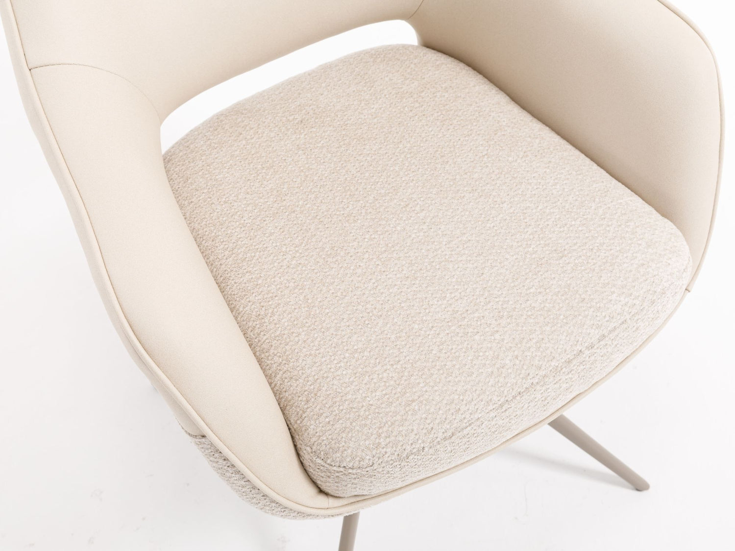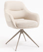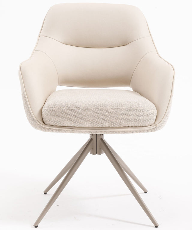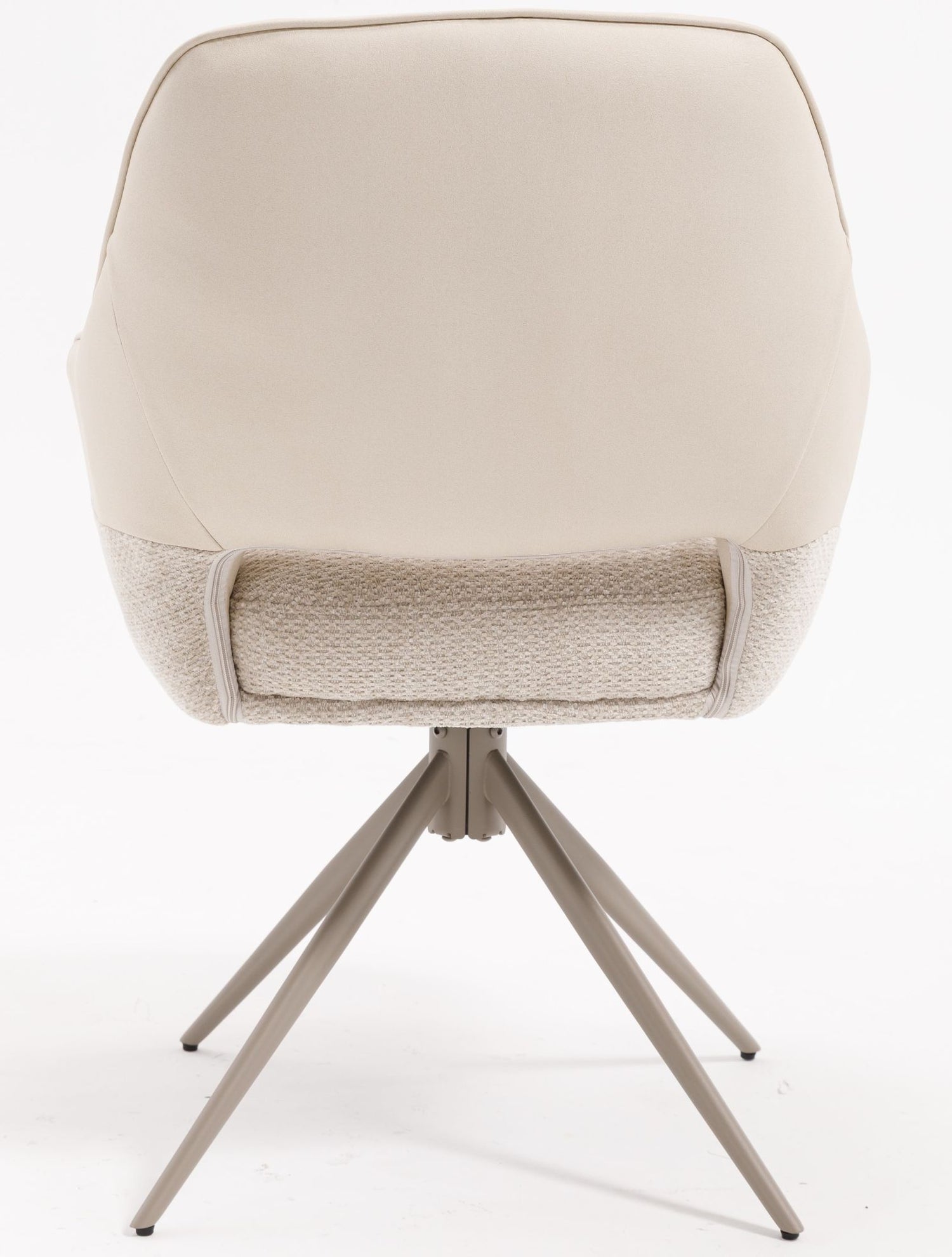 Esszimmerstuhl mit Armlehnen, bezogen mit beigefarbenem Stoff und ausgestattet mit Taschenfederung und einem 360°-Drehmechanismus im Fußkreuz.
