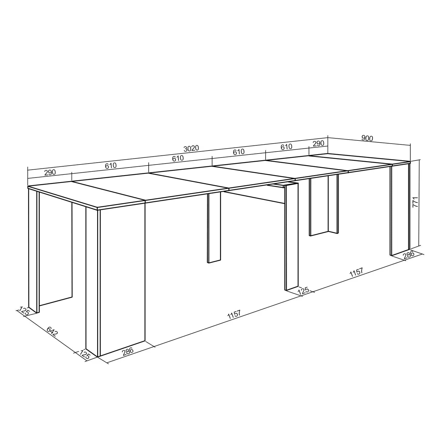 Der ausziehbare Konsolentisch von Skraut Home ist ein praktischer ausziehbarer Konsolen- und Esstisch mit mehreren Montagepositionen. Teleskopmechanismus aus Aluminium mit zentralem Bein, das der Struktur Stabilität verleiht. Der Tisch verfügt über Verankerungsmechanismen, die die Baugruppe in jeder Position fixieren und sichern und ein ungewolltes Öffnen verhindern. Konsole in schwarzer Ausführung mit hochwertiger poröser Holzmaserung. Abmessungen der geschlossenen Konsole: 90 cm breit x 58 cm tief. Variable Länge: mit einer Verlängerung 119 cm, mit zwei Verlängerungen 180 cm, mit drei Verlängerungen 241 cm, mit vier Verlängerungen 302 cm. Es bietet Platz für bis zu 14 Personen. Verlängerungen aus Holz in Eichenholz und schwarzer Oberfläche mit hochwertiger poröser Maserung.