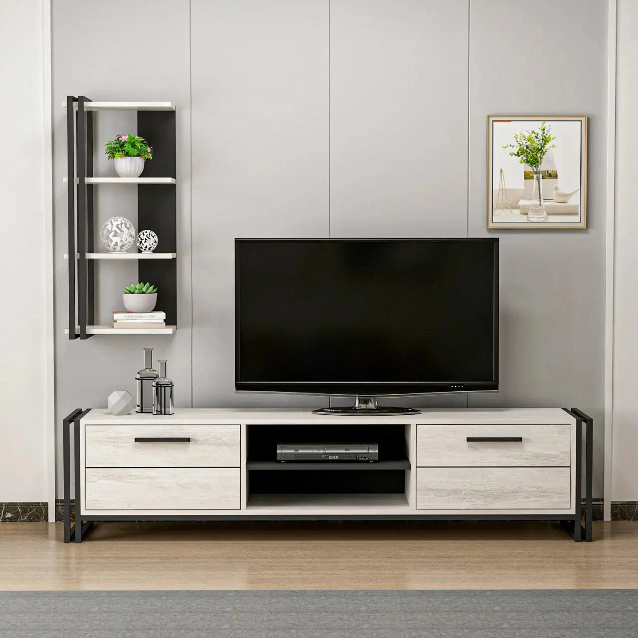 Das Moritz TV-Möbel kombiniert modernes Design mit hoher Funktionalität und passt sich perfekt in verschiedene Einrichtungsstile ein. Die getrommelte weiße Oberfläche und die robusten Metallbeine verleihen diesem Möbelstück eine elegante und zeitlose Ästhetik.