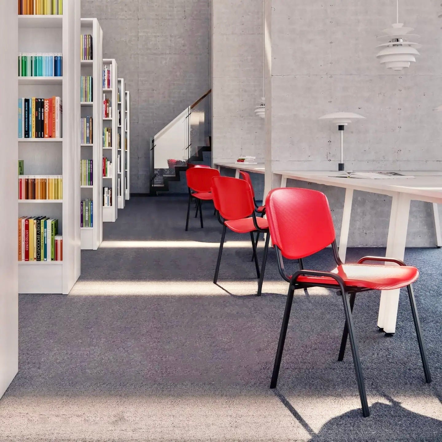 Der Sitz und die Rückenlehne bestehen aus strapazierfähigem Polypropylen, das in verschiedenen modernen Farben wie Grau, Blau, Rot und Schwarz erhältlich ist. Die ovale Struktur des Stuhls (30 x 15 x 1,5 mm) mit rutschfesten Nieten sorgt für Stabilität und sicheren Halt. Mit einem Gewicht von nur 4,4 kg lässt sich der Stuhl problemlos bewegen und umstellen.