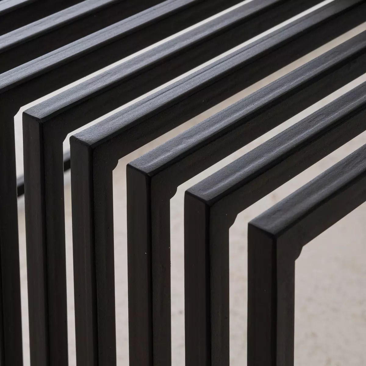 Das schwarze, pulverbeschichtete Metallgestell bildet einen spannenden Kontrast zum warmen Holz und unterstreicht den modernen Industrie-Look. Durch die asymmetrische Konstruktion ragt ein Teil des Metallrahmens über die Tischplatte hinaus und schafft so eine optisch markante Formgebung.