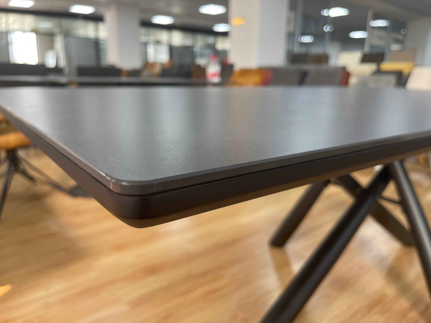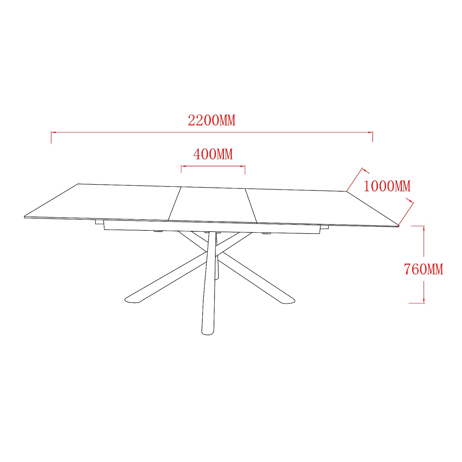 Ausziehbarer Tisch mit schwarzer Keramiktischplatte, die von 180 cm auf 220 cm verlängert werden kann.