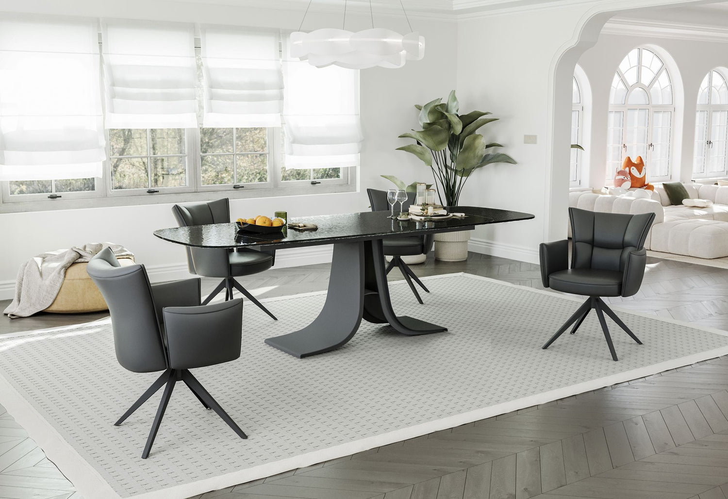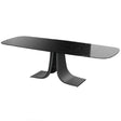 Großer Ausziehtisch mit schwarzer Glasplatte und zwei Verlängerungsplatten.
