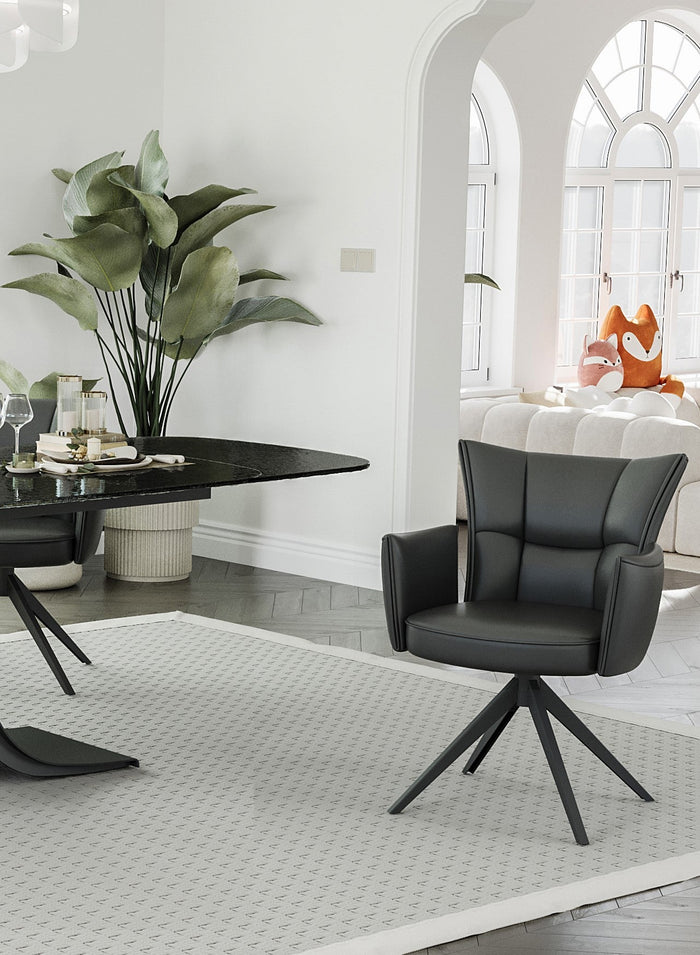 Rose 360º-Drehstuhl, graue Polsterung, schwarze Metallbeine.