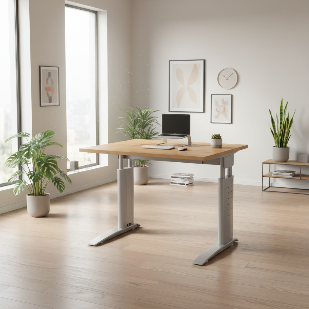 US08 Schreibtisch. 80 x 80 cm Platte: Esche Eiche. 25 mm stark. 2 mm ABS-Kante rechteckiges C-Fuß-Gestell in silbergrau Arbeitshöhe 68-86 cm. werkzeuglos im 2 cm-Raster verstellbar horizontale Kabelwanne. Querschnitt 9 cm vertikale Kabelführung im Fuß Lieferung. Zustand: demontiert. Einfache Montage.