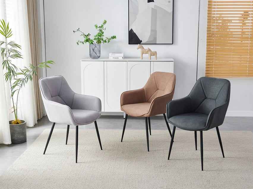 Der Stuhl ist mit einem hochwertigen Stoffbezug ausgestattet und in den Farben Hellgrau, Dunkelgrau und Braun erhältlich. Dadurch lässt er sich problemlos mit verschiedenen Einrichtungsstilen kombinieren – von modern bis klassisch.