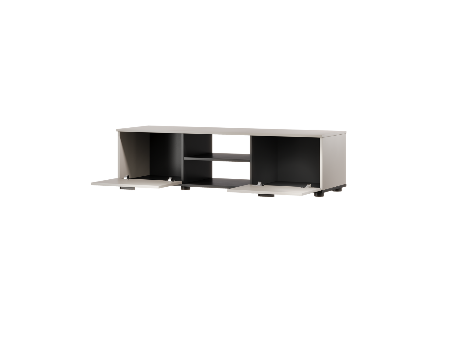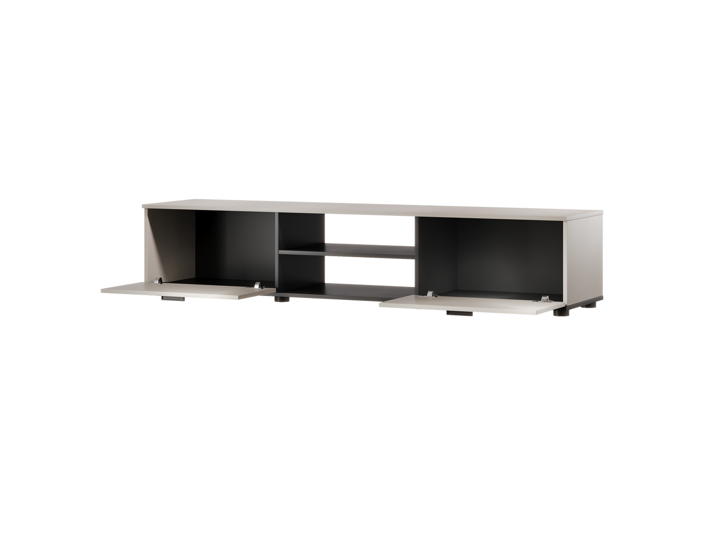 Weniger ist mehr. Das NUVOLA+ TV-Möbel verzichtet bewusst auf integrierte Beleuchtung, um die klare Linienführung und die exklusive Farbkombination wirken zu lassen. Die matte Kaschmir-Front harmoniert perfekt mit den tiefschwarzen Akzenten und schafft eine ruhige, luxuriöse Atmosphäre in Ihrem Wohnbereich.