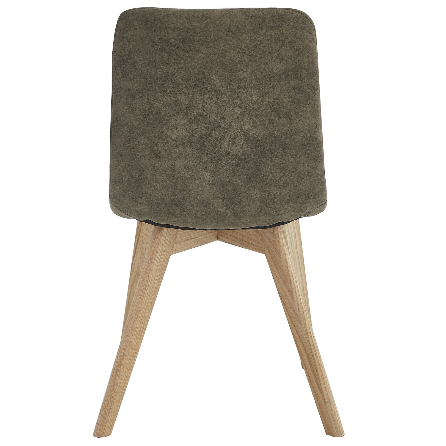 Der Stuhl verfügt über ein solides, vierbeiniges Gestell aus Eichenholz, das in einem natürlichen Farbton gehalten ist, um seinen organischen Charakter zu betonen und gleichzeitig eine hervorragende Stabilität zu gewährleisten. Dadurch ist er ein vielseitiges Möbelstück für sowohl legere als auch formelle Esszimmer.