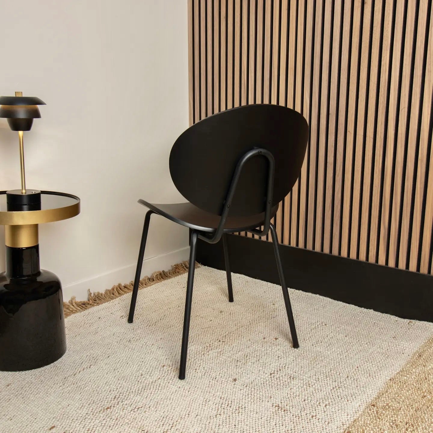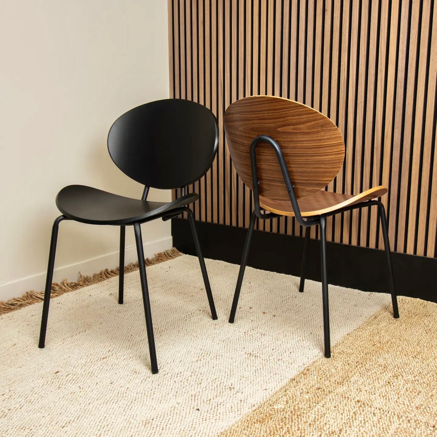 Die Sitzfläche und die Rückenlehne bestehen aus hochwertigem Pappelholz-Sperrholz, das für Komfort und Langlebigkeit sorgt. Das stabile Metallgestell in Schwarz unterstreicht das moderne Design und sorgt für sicheren Halt.