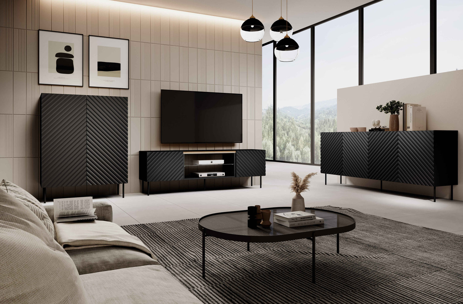 Lowboard VANTARA 200×54×40cm – Schwarz matt / Eiche Artisan