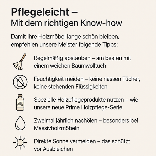 Unsere Holzmöbel sind nicht nur stilvoll, sondern auch langlebig – wenn man sie richtig pflegt. So bleibt dein Lieblingsstück aus Eiche, Akazie oder Wildeiche dauerhaft schön: