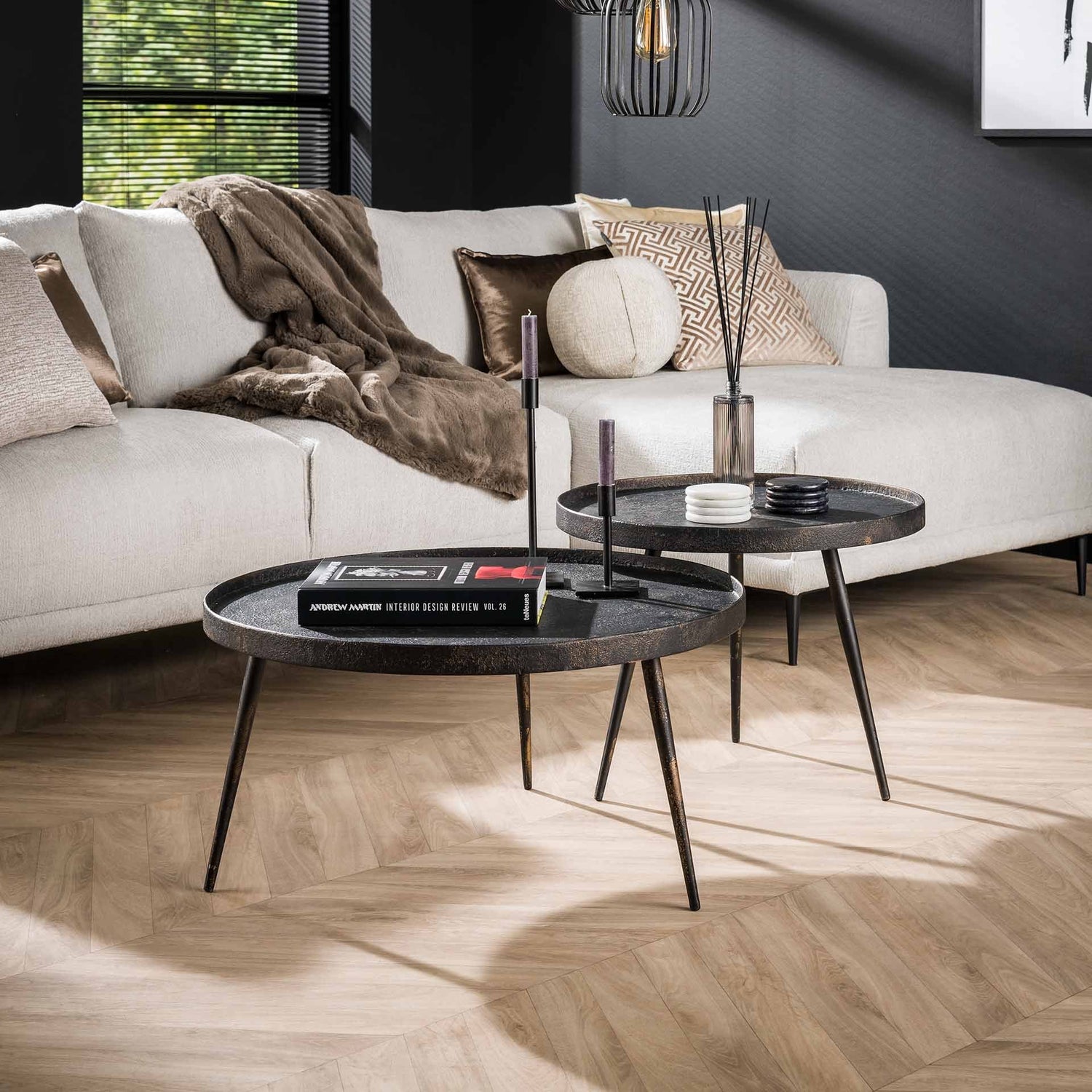 Das „Metallica“-Couchtischset überzeugt durch modernes Design und Funktionalität. Es besteht aus zwei runden, pulverbeschichteten Tischen mit einem eleganten grauen Metallic-Finish. Die beiden Tische ergänzen sich in ihrer Höhe perfekt: Der kleinere Tisch ist höher, sodass sie vielseitig kombiniert werden können.